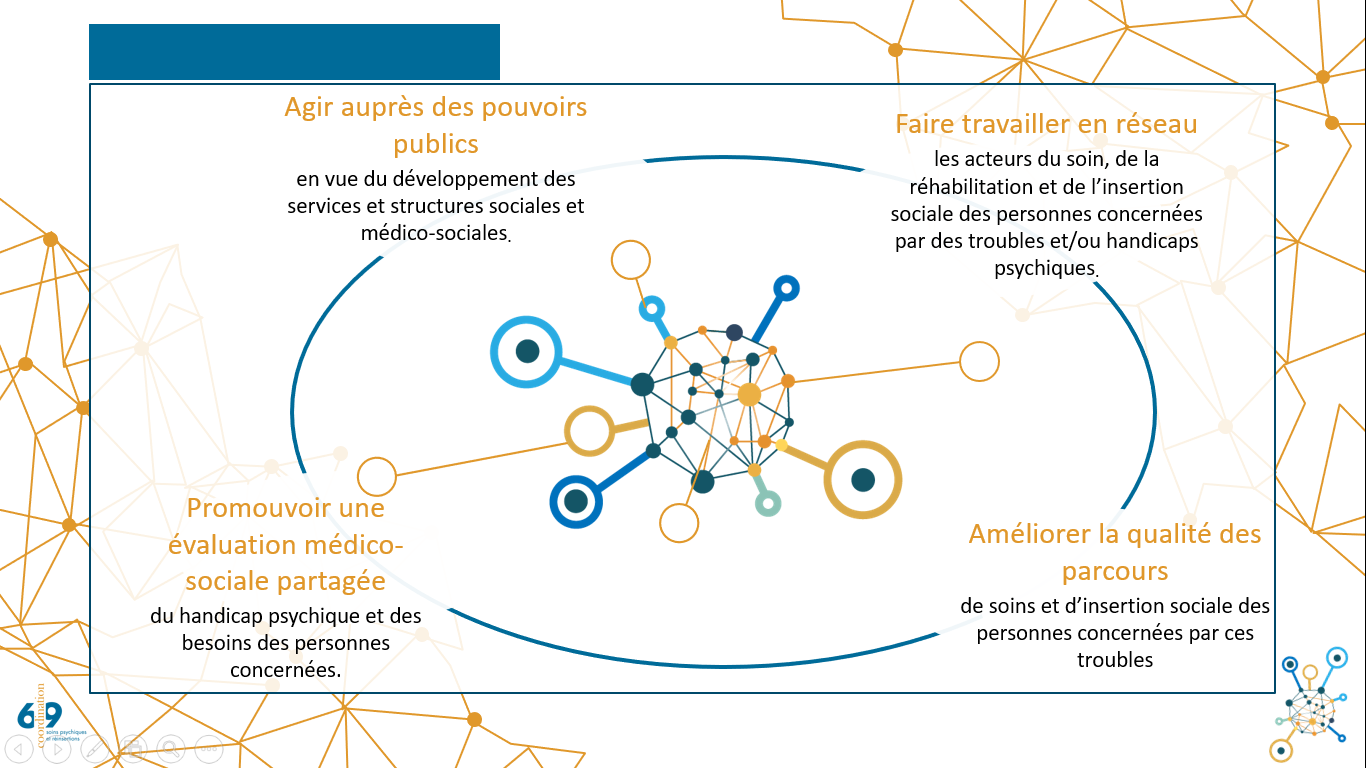 Ce noyau initial s’est rapidement augmenté des établissements de santé mentale non sectorisés et des autres acteurs associatifs de l’emploi, du logement et de l’accompagnement à la vie sociale. L’ensemble de ces structures ont la même ambition humaniste d’agir collectivement et solidairement en faveur des parcours d’insertion socio-professionnelle et citoyenne des personnes concernées par des troubles psychiques. Elles ont à cœur de lutter également contre la stigmatisation des personnes en situation de handicap psychique.